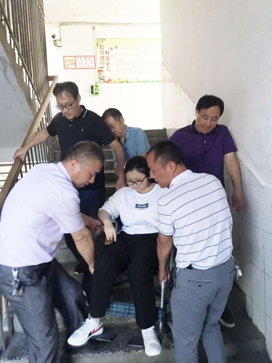 “考慮到她行動不便,我們適當?shù)卣{(diào)整了桌子之間的距離?!绷_明中表示,兩天來,晉淼在實驗中學考點服務(wù)工作人員的幫助下,從一樓抬進三樓考場。每場考場結(jié)束后,考點工作人員又把她從三樓抬下來,推到家長身邊。
