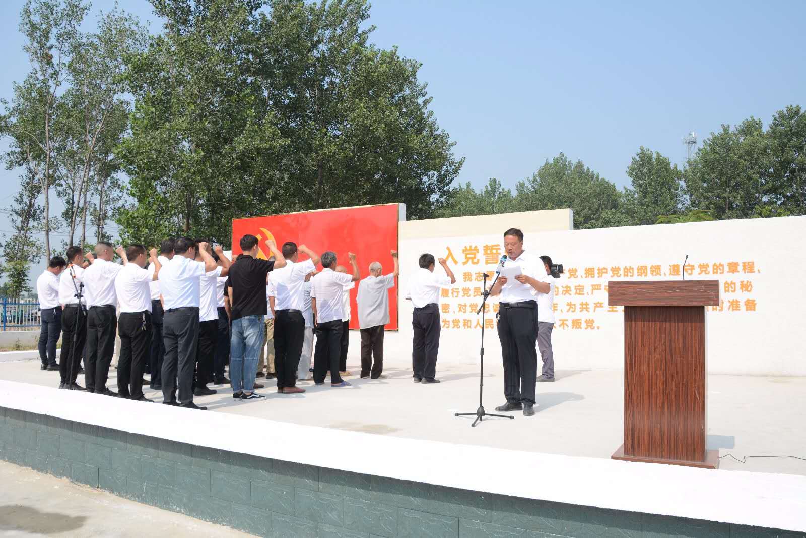 “我志愿加入中國共產(chǎn)黨,擁護黨的綱領(lǐng),遵守黨的章程……”升國旗儀式結(jié)束后,由紀莊支部書記李國喜領(lǐng)誓,全體黨員面對鮮紅黨旗,胸前佩戴黨徽,排著整齊的隊列,高高舉起右手,再次向黨作出了莊嚴地承諾,重溫入黨誓言,聲聲入耳,句句入心。