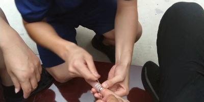 經(jīng)過(guò)查看,由于尺寸不合適,該男子左手中指已經(jīng)被戒指卡的出現(xiàn)充血,手指腫脹嚴(yán)重。考慮到用剪切器等器械剪戒指可能會(huì)傷到手指,指戰(zhàn)員利用纏線(xiàn)解線(xiàn)的方法,用細(xì)線(xiàn)穿過(guò)戒指在手指上纏繞,然后慢慢拉線(xiàn),利用細(xì)線(xiàn)的滑潤(rùn)效果幫助取下戒指,很快戒指被成功取下。