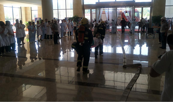 此次演練模擬一個(gè)蒙面歹徒在該縣六樓某科室打砸并故意縱火,轄區(qū)公安干警、消防指戰(zhàn)員及醫(yī)院保安力量迅速出動(dòng)處置,防恐人員及時(shí)將犯罪分子制服,而此時(shí)醫(yī)院內(nèi)火災(zāi)迅速蔓延,多名醫(yī)護(hù)人員被困火場無法逃生,醫(yī)院負(fù)責(zé)人通過應(yīng)急廣播進(jìn)行人員疏散,消防指戰(zhàn)員按照預(yù)定應(yīng)急處置方案迅速展開滅火救援行動(dòng)。