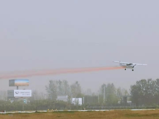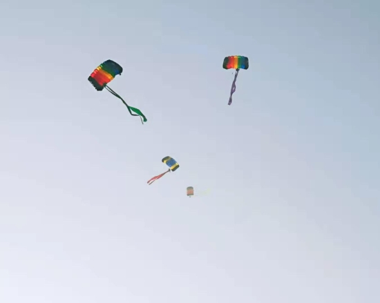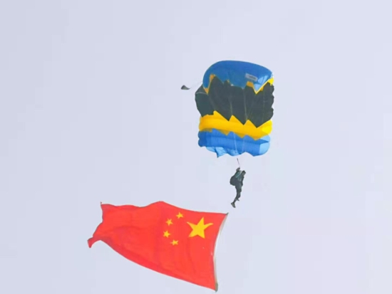 “看,跳傘表演開(kāi)始了?!?0月29日上午,周口西華通用機(jī)場(chǎng)首航儀式結(jié)束后,一場(chǎng)精彩絕倫的飛行表演就開(kāi)始了。載著跳傘運(yùn)動(dòng)員的飛機(jī)起飛到指定地點(diǎn)后,運(yùn)動(dòng)員攜帶著國(guó)旗和彩帶從高空中跳下,打開(kāi)傘包后,空中五顏六色十分漂亮,引得圍觀群眾不時(shí)叫好。