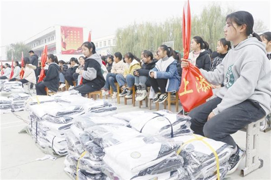 當(dāng)日上午,太康縣毛莊鎮(zhèn)一中1800多名學(xué)生圍坐在操場(chǎng)上,看著面前碼放整齊的新校服,十分激動(dòng)(如圖)。捐贈(zèng)儀式開始后,太康萬城商貿(mào)董事長(zhǎng)陳家濟(jì)等愛心人士,為學(xué)生挑選、試穿新校服。同學(xué)們抱著新校服,向好心的叔叔道謝。