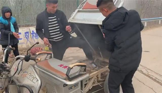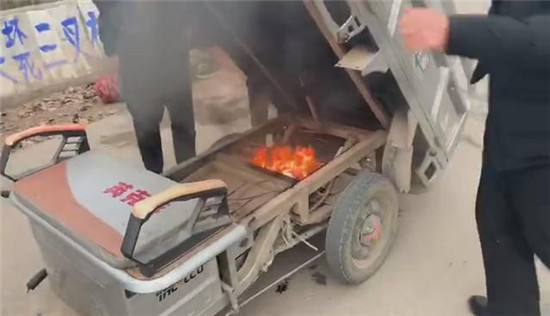 淮陽:三輪車突然短路起火 消防隊員手捧泥土滅火