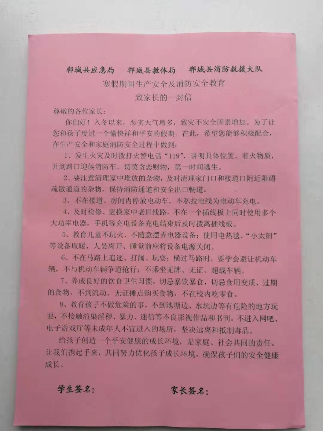 1月13日,寒假即將到來。鄲城縣為進(jìn)一步加強(qiáng)春節(jié)期間的安全生產(chǎn)和消防安全工作,鄲城縣印制30萬份《寒假期間生產(chǎn)安全和消防安全教育致家長的一封信》,發(fā)放到全縣近30萬名中小學(xué)生手中,希望通過“小手拉大手”的形式,廣泛傳播生產(chǎn)安全和消防安全知識,確保全縣廣大人民群眾度過一個安全祥和的春節(jié)。