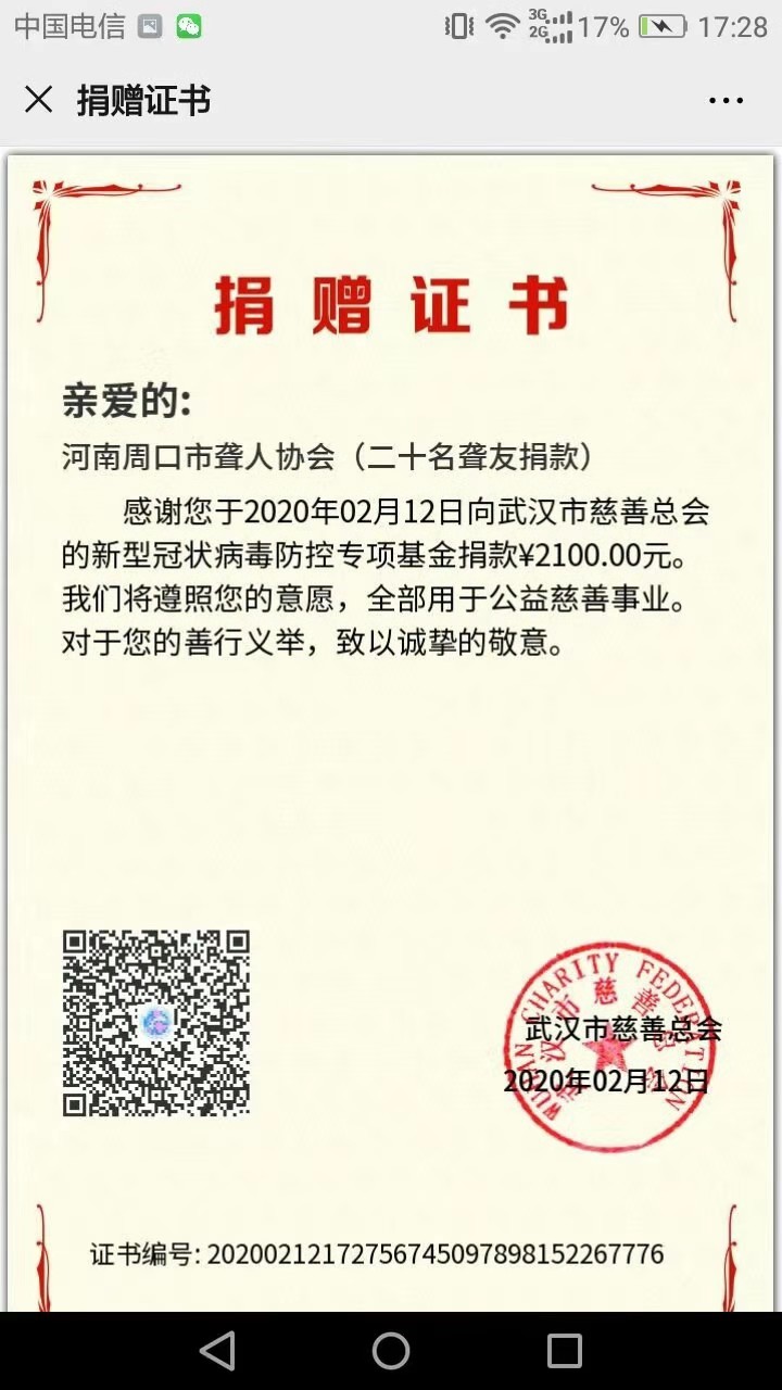 2月12日,2100元的捐款轉(zhuǎn)到了武漢市慈善總會,這是來自河南周口市聾人協(xié)會20名聾友的一份愛心。