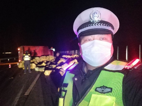 2月15日晚,一輛滿載著蔬菜的大貨車在大廣高速周口轄區(qū)內(nèi)側(cè)翻,一車娃娃菜傾倒在高速路上,占據(jù)了兩個車道,急需救援。市公安局交通管理支隊高速二大隊民警接警后迅速救援,幫助運送保障物資的司機先去送貨,再回來處理事故。
