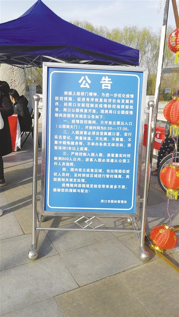 當日上午10時許,記者在周口公園看到,在南門入口處的醒目位置,擺放著一個公告牌,寫有入園須知,上面顯示疫情防控期間的開園時間為8:30~17:30,不少游客駐足觀看。入口處,周口市園林管理處疫情防控宣傳臺前的工作人員正忙碌著。游客需間隔1米距離排隊,經(jīng)測量體溫、登記身份證號、雙手噴灑酒精后方可進園。雖然入園程序有點繁瑣,但是游客都非常配合。