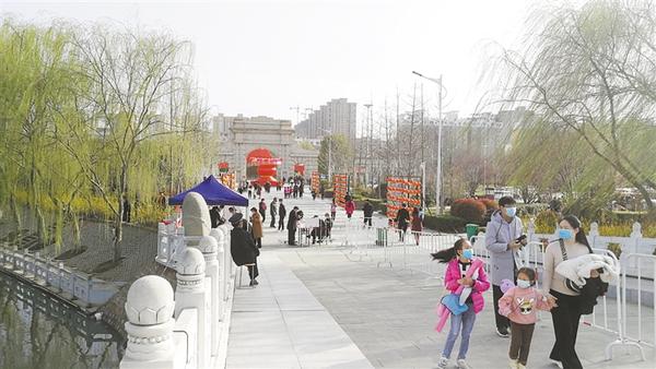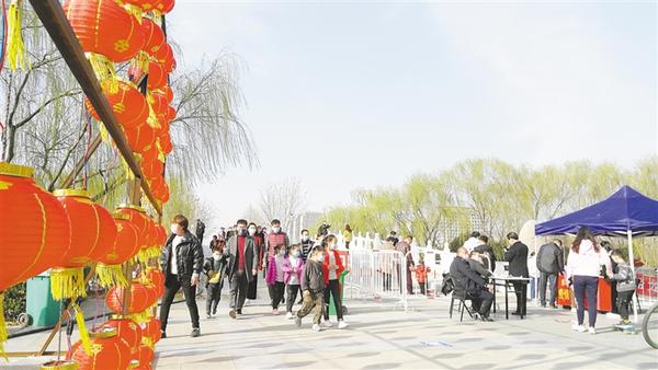記者沿周口公園主干道向里走看到,路旁的花燈鮮艷奪目,如意湖邊楊柳依依,園內(nèi)迎春花開、玉蘭飄香,滿園春色如期而至。記者發(fā)現(xiàn),游客們?nèi)齼蓛傻模饕约彝閱挝灰黄鹩瓮?,沒有出現(xiàn)扎堆現(xiàn)象。