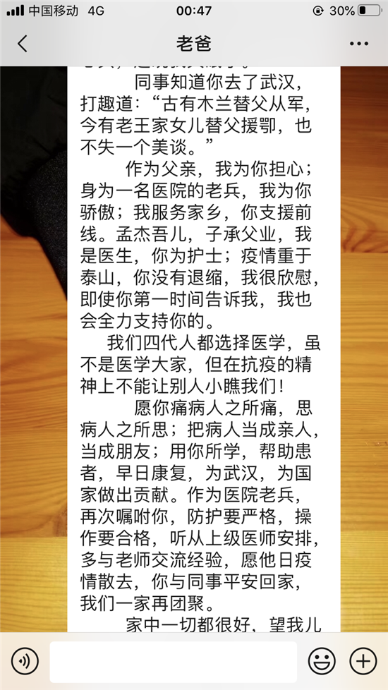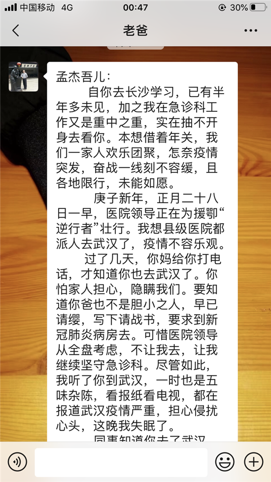 作為父親,我為你擔心;身為一名醫(yī)院的老兵,我為你驕傲;我服務(wù)家鄉(xiāng),你支援前線。孟杰吾兒,子承父業(yè),我是醫(yī)生,你為護士;疫情重于泰山,你沒有退縮,我很欣慰,即使你第一時間告訴我,我也會全力支持你的。