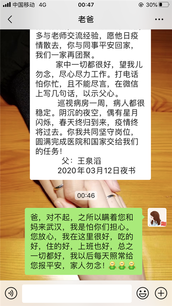 3月21日,周口援鄂醫(yī)療隊出征滿一月。當晚,王泉滔通過微信又鄭重給女兒說下這番話:一晃你在武漢一個月了,我和家人從你去武漢的擔心到現(xiàn)在的放心,這是國家給予我們的安心。農(nóng)民把地種好,教師把學教好,士兵把國門守好,醫(yī)護把病治好,都是自己的使命,更是自己的初心。人人懷揣私字,社會必敗,遭殃的終歸眾人;眾人心懷天下,萬物皆勝,受益的定是人人??吹胶幽喜糠衷踽t(yī)療隊從武漢凱旋歸來,雖然沒有你的身影,但是我們很高興,說明武漢的疫情已得到控制,我和家人一起期盼你早日歸來。但是還是要再次叮囑你,不要因為疫情到了最后而放松警惕,上下班路上注意安全,穿脫防護服不能有一絲懈怠,時刻保持警醒。年前你當了姑姑,雖然還沒有見到你侄子,但他和家人共同期待你平安回來。吾兒加油!