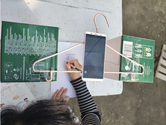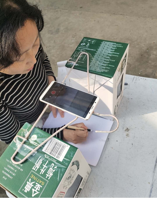 在備課時,朱霞很快遇到了難題:手機沒法固定,街上手機店又全部停業(yè),網上買的手機固定夾發(fā)不了貨。為了不耽誤學生上課,她想到用晾衣撐、牛奶箱做成簡易支架,組裝后居然效果不錯。就這樣,一個晾衣撐、兩個牛奶箱和一部手機組成了她的“三尺講臺”。