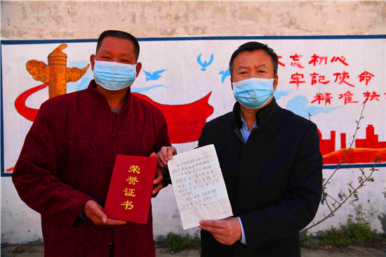 “疫情風(fēng)聲鶴唳,村里還有10家從武漢回村過年的村民,大年初一,上面要求封村了,鄉(xiāng)親們還是亂跑,到河邊扎堆釣魚,攆不散”,王志成說,他心急如焚,深知疫情嚴(yán)重,在這種情況下,一家人感染,一個村子的人咋辦?,一定得有人管。他在街上碰見十一組村民、退伍兵王明甫,兩人想法相合,隨即決定,成為自愿抗疫小分隊(duì),自己籌備物質(zhì),開展動員村民居家抗疫、幫助困難村民、對村里實(shí)施消毒等抗疫事宜。王明甫向縣農(nóng)發(fā)行駐村第一書記王長海匯報后,得到大力支持。