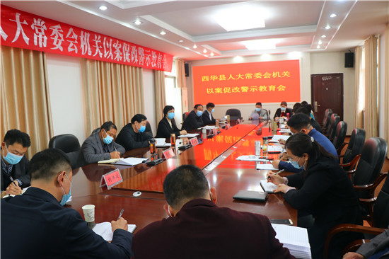 4月16日,西華縣人大常委會機關召開全體人員會議,開展以案促改警示教育,安排部署脫貧攻堅等工作??h人大常委會黨組書記、主任周曉燕,副主任趙曉春,黨組成員、副主任王心坎、龐有敬出席。黨組副書記、副主任張國玉主持。