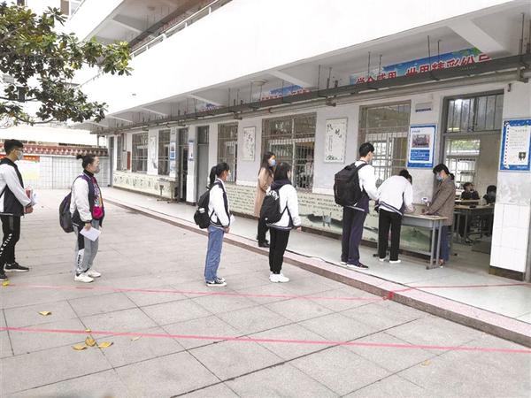 4月20日6時50分,記者在周口四中門口看到,學生們在家長的陪伴下陸續(xù)趕來,按照學校提前下發(fā)的入校流程,在校門口間隔一米距離有序排隊。然后,他們按規(guī)定依次遞交健康承諾表后,在值班教師的引導下,通過大門兩側(cè)設(shè)置的體溫測試通道入校,每個通道處都有工作人員負責引導學生、噴灑消毒液。