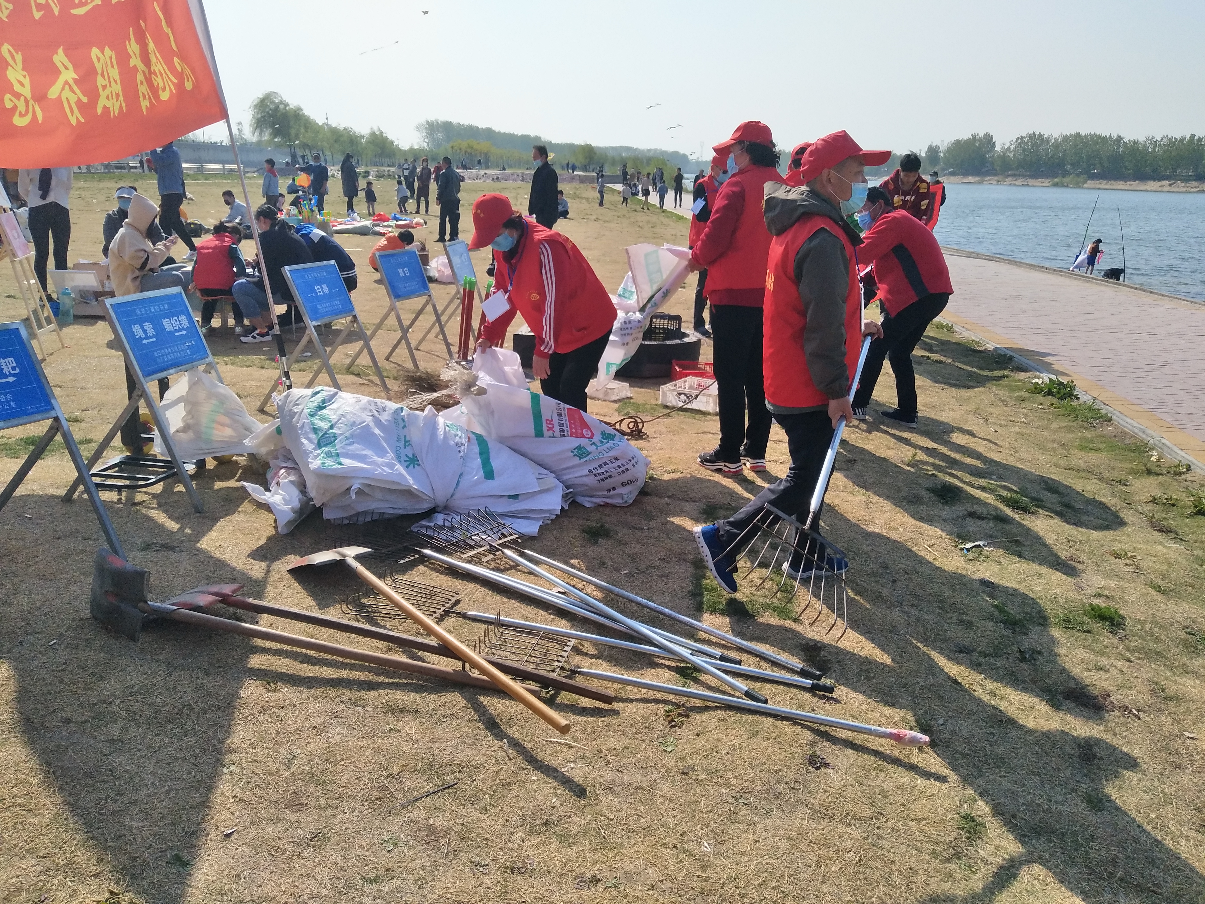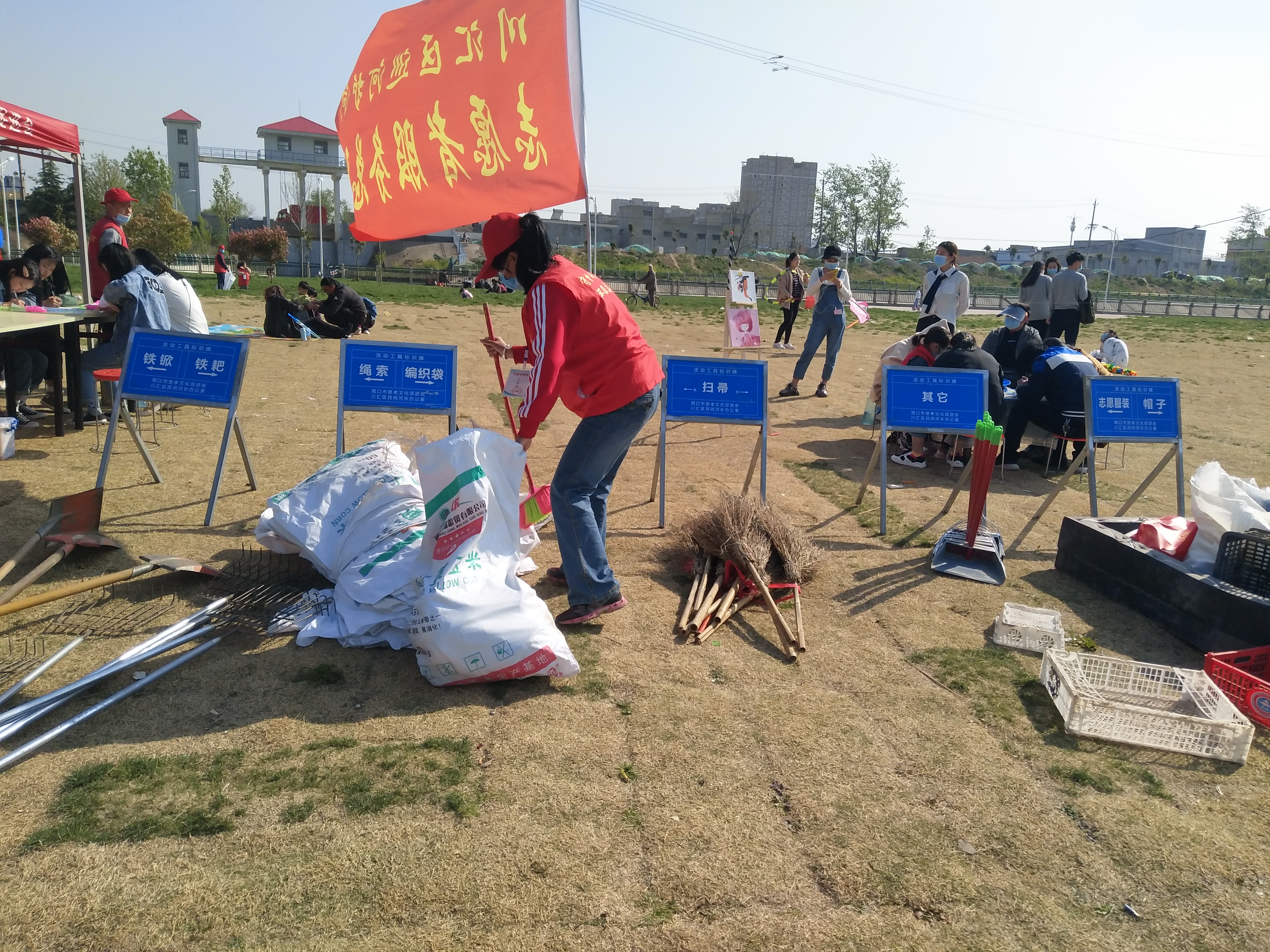 問卷棚旁是擺放整齊的河面垃圾清理工具,鐵锨、鐵耙、繩索、編織袋、掃帚、垃圾箱一字排開,寫有“川匯區(qū)巡河護河”、“志愿者服務(wù)總隊”字樣的紅旗迎風飛揚。記者向志愿者借了身衣服,和大家一起等著護河總指揮孫彩云分工。