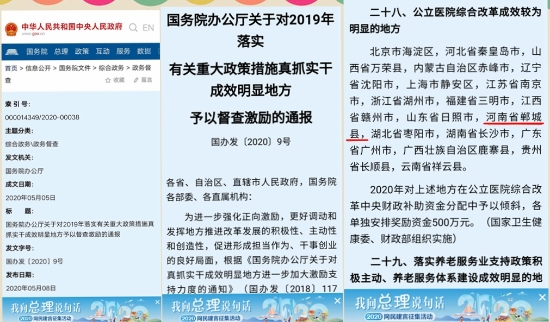 5月8日,中華人民共和國中央人民政府門戶網(wǎng)站發(fā)布《國務院辦公廳關(guān)于對2019年落實有關(guān)重大政策措施真抓實干成效明顯地方予以督查激勵的通報》國辦發(fā)〔2020〕9號文件,對213個地方予以督查激勵,相應采取30項獎勵支持措施。其中,鄲城縣榮登“對公立醫(yī)院綜合改革成效較為明顯的地方”名錄,獲獎500萬元。