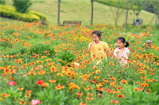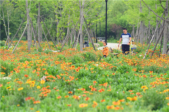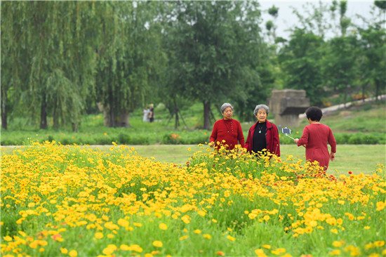 5月17日,市民徜徉在東方園林的花海中,暢享休閑樂趣。近期,位于沙潁河南岸的東方園林內,成片的天人菊等花卉相繼盛開,猶如五彩的花海,不少市民來些游玩、拍照。