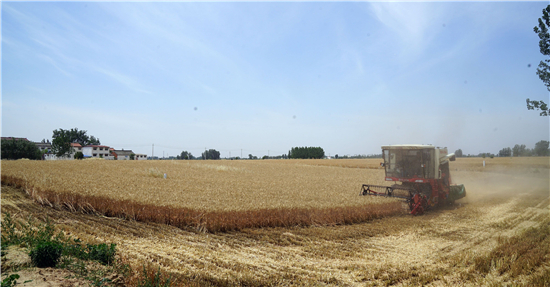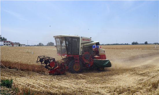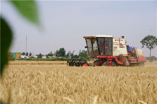 5月28日,在周口市西華縣遲營(yíng)鄉(xiāng)前喜村,農(nóng)民駕駛收割機(jī)在田間收割小麥。 眼下,周口市近千萬(wàn)畝小麥陸續(xù)開(kāi)鐮收割,當(dāng)?shù)剞r(nóng)民搶抓農(nóng)時(shí)收割小麥,確保顆粒歸倉(cāng)。 記者 金月全 攝