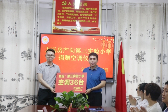 “方遠(yuǎn)房地產(chǎn)公司為第三實驗小學(xué)捐贈空調(diào),大大改善學(xué)校的降溫條件,為孩子們營造更為舒適的學(xué)習(xí)環(huán)境?!钡谌龑嶒炐W(xué)校長王玉剛表示,學(xué)校將以此為契機,號召廣大學(xué)生好好學(xué)習(xí),長大后回報社會;全校教職員工以優(yōu)異的教學(xué)業(yè)績回報社會,傳遞愛心,努力辦學(xué)生快樂、教師幸福、家長滿意的現(xiàn)代化學(xué)校。