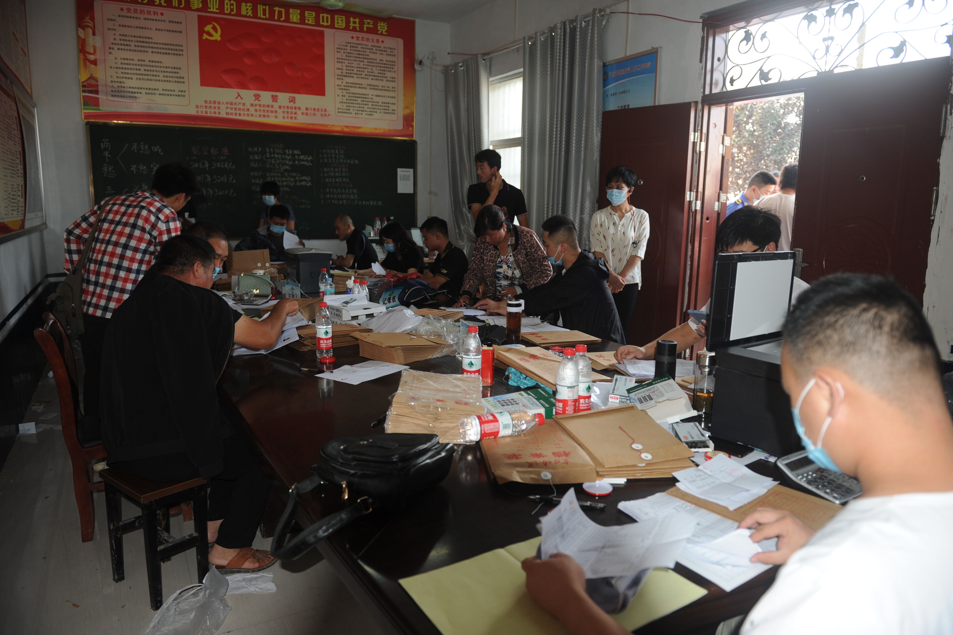 村室內(nèi),工作人員有的在忙著為群眾復(fù)印材料,有的在緊張地為群眾簽訂房屋拆除協(xié)議,大家都忙得不可開交。