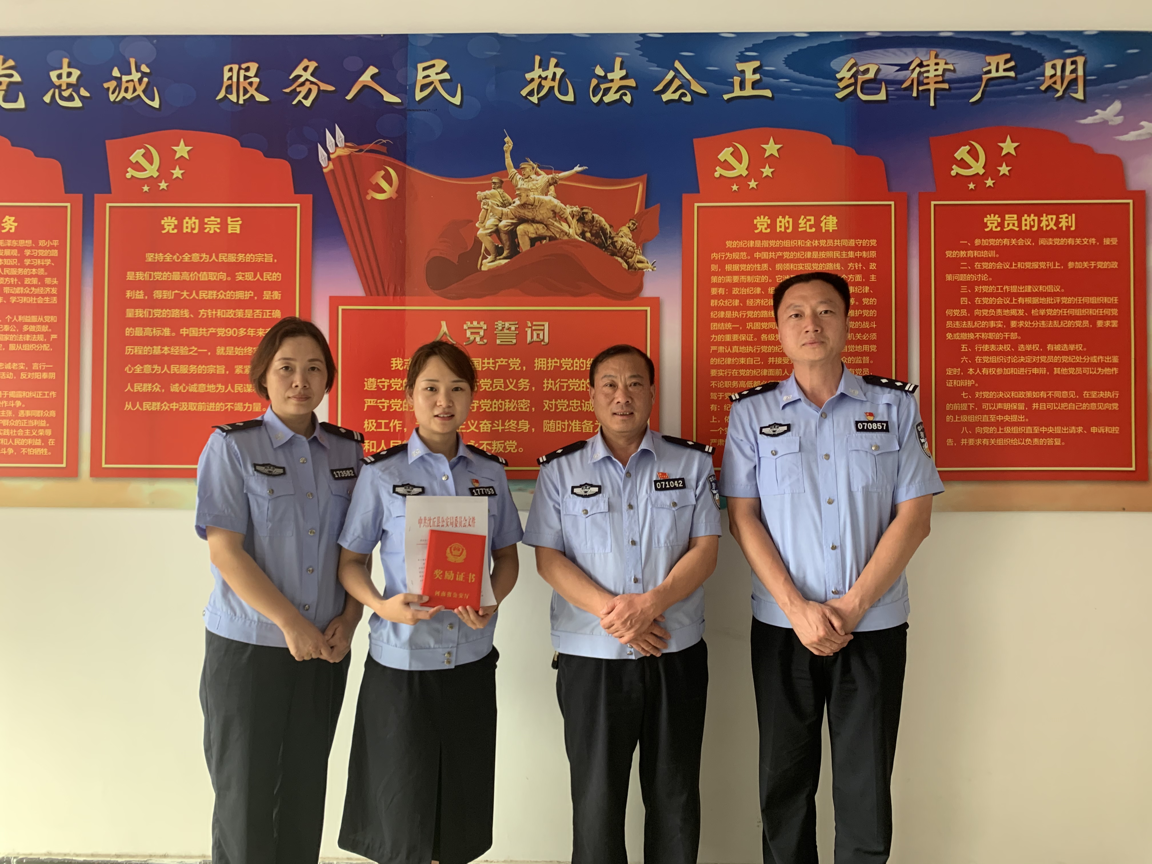 7月5日上午,沈丘縣公安局黨委委員、政辦室主任黃長春、組教科科長李文艷到西關派出所,為在“迅雷”行動中表現(xiàn)優(yōu)異,抓獲7名違法犯罪嫌疑人的女民警梁梁同志送個人嘉獎。