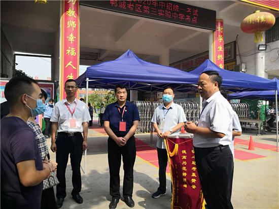 “該中招考試了,俺孩子錦博卻在7月8日騎電動(dòng)車摔斷了腿,這該咋辦,我和孩子他爸都愁壞了,沒想到我們一家在7月14號(hào)下午來第三實(shí)驗(yàn)中學(xué)看考場(chǎng)時(shí)候,第三實(shí)驗(yàn)中學(xué)考點(diǎn)主考付曄和第三實(shí)驗(yàn)中學(xué)校長孟杰發(fā)現(xiàn)了我們的情況后,對(duì)我們說:“你們放心,孩子考試的事情就包在我們身上。”立即安排學(xué)校李蘭君老師、張子江老師專門護(hù)送孩子進(jìn)出考場(chǎng),并安撫孩子專心考試,不要有什么心理負(fù)擔(dān)。聽孩子說這幾場(chǎng)考試,李蘭君老師和張子江老師都是背著孩子上下樓、去廁所、出考場(chǎng),對(duì)于你們的幫助,我真不知道該說什么好,真的太感謝你們了,謝謝!謝謝!中考考生劉錦博媽媽眼含淚花動(dòng)情地說,并把一面寫著“暖心助考贏贊譽(yù),德高為范鑄師魂”的錦旗交給鄲城縣教體局黨組書記、局長羅明黨手中。