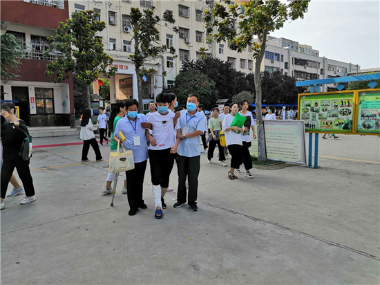 “終于到了,要不是身體好,還真不能一口氣把這孩子背上三樓。”鄲城縣第三實(shí)驗(yàn)中學(xué)考務(wù)老師張子江邊擦汗邊笑著說。