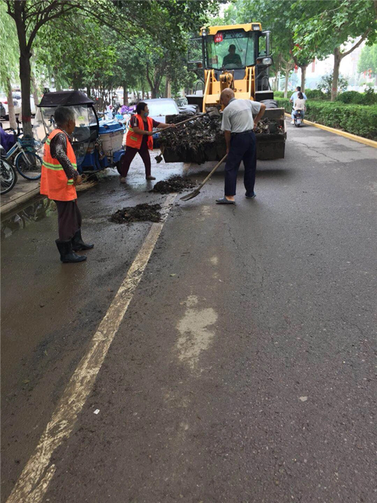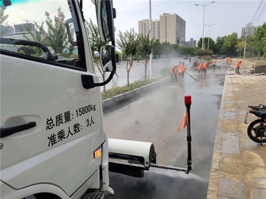 強降雨過后,道路泥沙沉積嚴(yán)重。開發(fā)區(qū)公用事業(yè)管理中心迅速行動,組織環(huán)衛(wèi)工人,出動高壓清洗車、灑水車、洗掃車等作業(yè)車輛,對道路進行機械化聯(lián)合清洗、清掃工作。