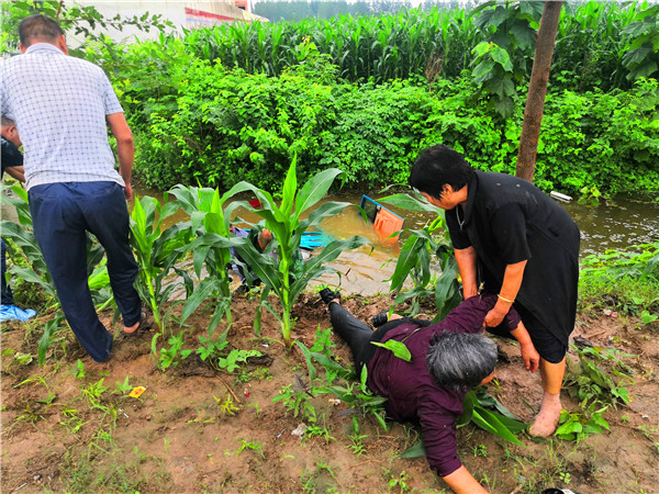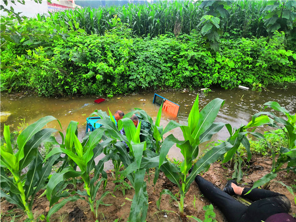 7月26日,連續(xù)多日的降雨已導致農村坑滿河平、積水頗深。當日下午4時,依然時雷聲陣陣、雨如豆粒,二人在宜路鎮(zhèn)張寨村小學附近的玉米田間拍照核查“圖斑”時,看到一輛車箱內載有幾位老人的電動三輪車冒雨從路邊疾駛過去。緊接著聽到“撲通”一聲,趙文波、李偉二人立即意識到是三輪車掉進路溝、落水了。
