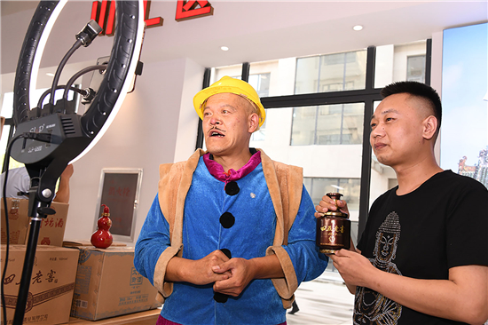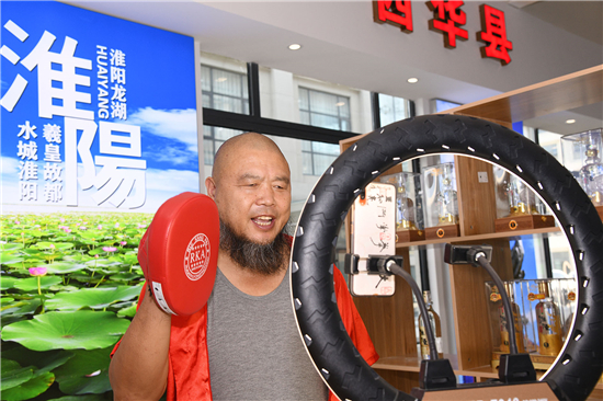 記者看到,川匯區(qū)直播電商產(chǎn)業(yè)基地直播大廳內(nèi),全市各個縣市區(qū)都在此設(shè)有土特產(chǎn)直播區(qū),川匯區(qū)賣的有伏羲貢酒等,淮陽區(qū)賣的泥泥狗、布老虎、黃花菜、健身器具等,西華縣賣的有胡辣湯料等各種土特產(chǎn)。商家們“八仙過海,各顯神通”紛紛請來各路網(wǎng)紅大咖們助力直播。川匯區(qū)四五酒業(yè)請來“光頭強(qiáng)”熱賣四五老酒,西華縣的商家請來“趙本山”帶貨直播叫賣。