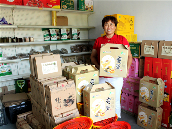 幾年前,孔粉蓮曾干過建材生意,賣過油漆、涂料等,但最讓她得心應(yīng)手的還是經(jīng)營(yíng)當(dāng)?shù)氐霓r(nóng)特產(chǎn)品。她在村里開了一家小門店,代銷當(dāng)?shù)氐暮睖?、石磨面、食用菌、紅薯粉條等,顧客贏門,生意很是紅火。