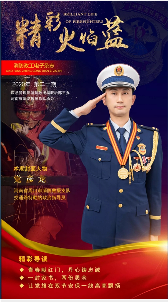 在最近一期《精彩火焰藍(lán)》電子雜志上,封面人物是來自周口消防救援支隊(duì)交通路特勤站政治指導(dǎo)員黨彥龍。該電子雜志封面人物主要介紹 “河南省最美消防人”、“河南省人民滿意的政法干警”、河南省“優(yōu)秀人民警察”等優(yōu)秀人物。