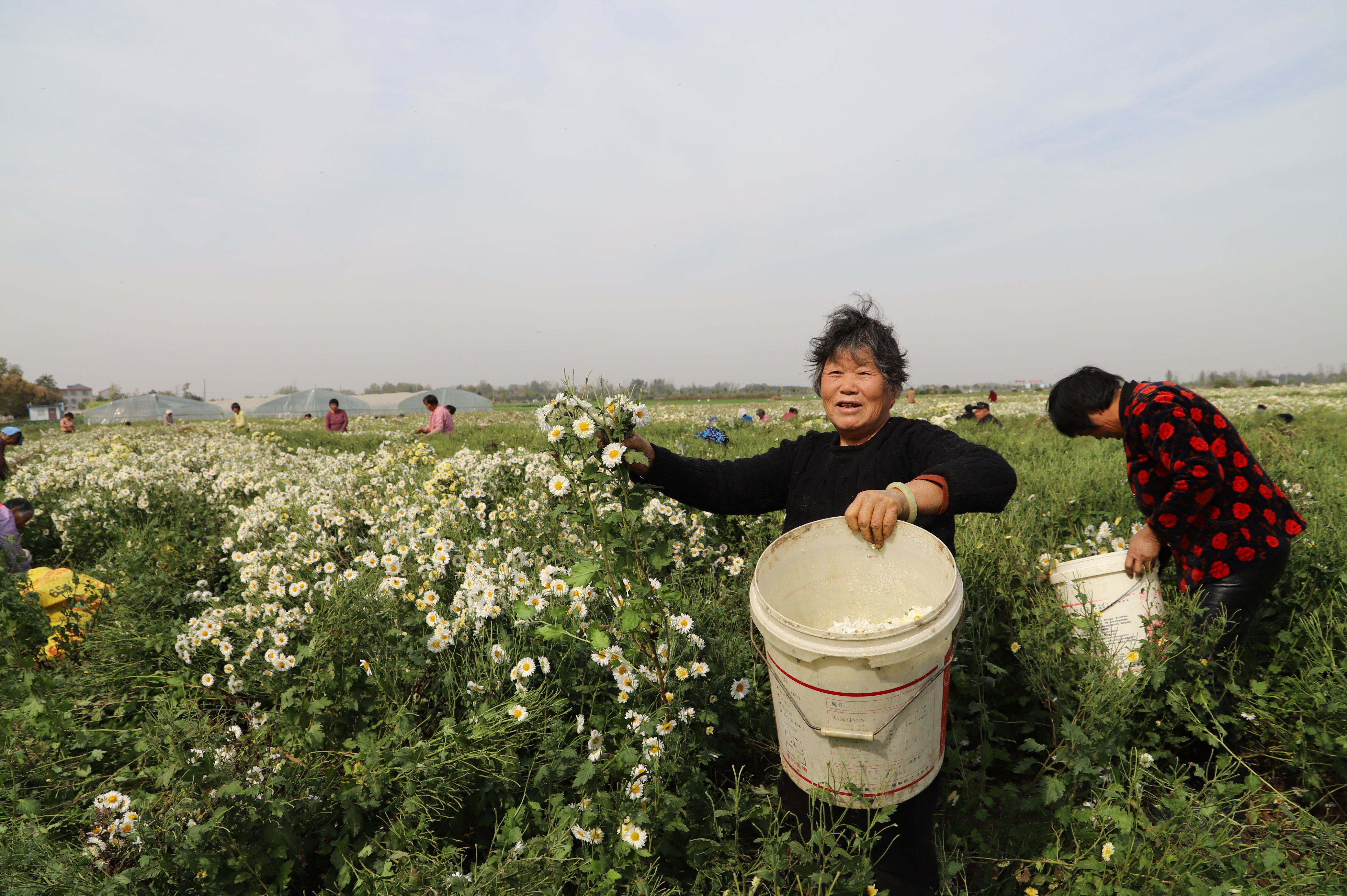 “她四十來歲,年輕手兒快,一天能摘300斤,掙100多元。”循著大家羨慕的眼光和手指的方向,記者來到晉潘潘身邊。果然,別人拿的都是塑料桶,她帶的是一個大編織袋,而且一人把持2米寬的地壟。只見她雙手順著菊花的莖向上一捋,滿滿兩把菊花應(yīng)聲而落,而且很少有碎花現(xiàn)象。聽著大家的夸贊,晉潘潘得意地說:“我掙錢多請大家喝菊花茶?!?/p>