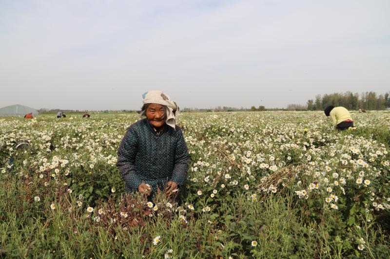 原來,菊花田的老板叫晉振中,于2018年從全縣脫貧攻堅(jiān)種植信息渠道得知種菊花能致富,銷售的末端是安徽亳州的藥材市場和一些花茶商家。特別是種植方式和平原種植紅薯一樣,把田地打成壟,栽苗、施肥、澆水、除草,9月份采摘一次、11月份采摘一次,剩下的菊花秸稈粉碎到田間作為肥料,還能種植晚小麥,十分方便。于是,他通過鎮(zhèn)村兩級黨員干部協(xié)助流轉(zhuǎn)了100畝土地,2019年就掙了20多萬元。由于晉菜園村是貧困村,在他的菊花田務(wù)工的勞動力大多是貧困戶,能帶動近百戶貧困戶脫貧致富,晉振中欣慰地覺得自己為脫貧攻堅(jiān)做了一份大貢獻(xiàn)。