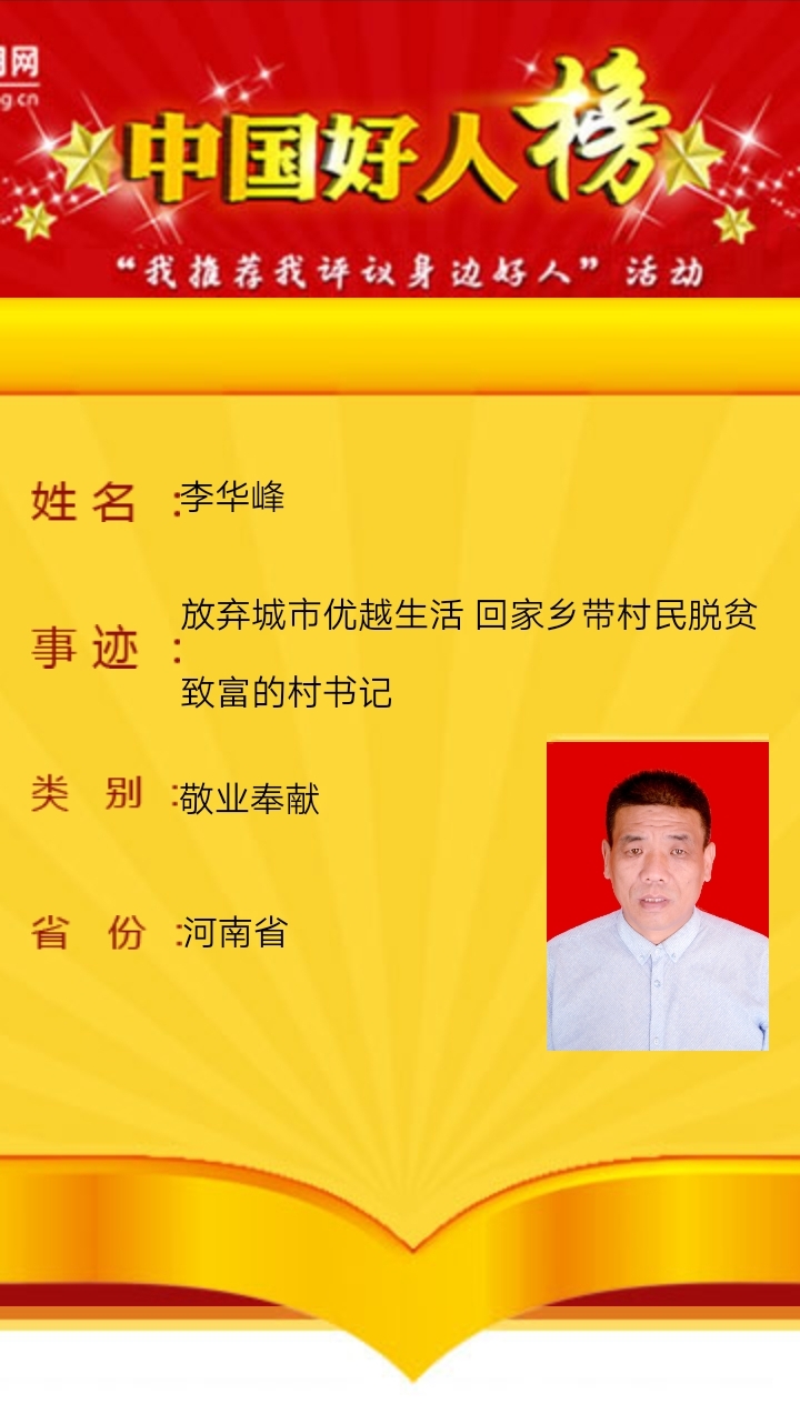 昨日,記者從市文明辦獲悉,今年46歲現(xiàn)任太康縣轉(zhuǎn)樓鎮(zhèn)李報真行政村黨支部書記的李華峰,放棄城市優(yōu)越生活,回鄉(xiāng)帶領(lǐng)村民致富,榮登2020年10月份“敬業(yè)奉獻”類“中國好人榜”。至此太康縣中國好人達到67人。