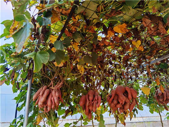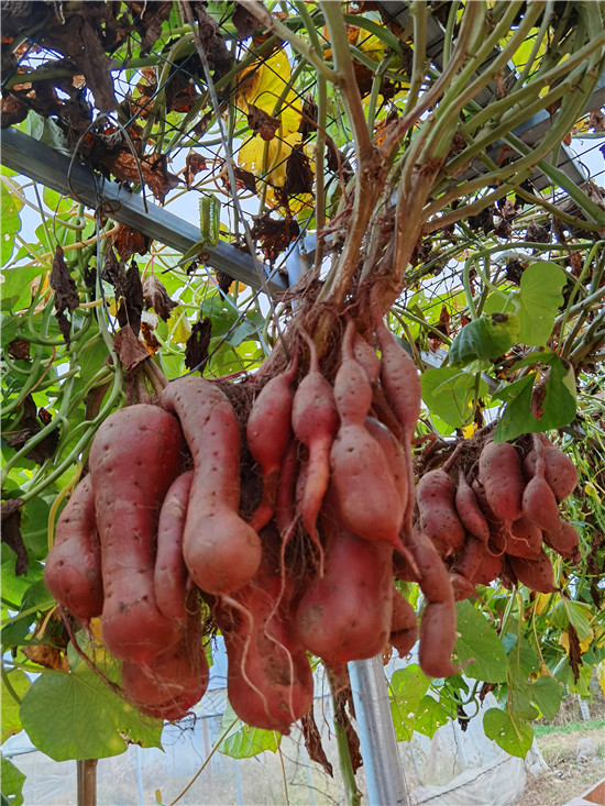 西華縣農(nóng)科所積極開展“空中結薯”試驗種植研究,并取得成功?!翱罩薪Y薯”采取嫁接技術,選用旋花科植物牽牛作砧木,脫毒薯苗作接穗嫁接而成,嫁接成活后栽到土壤里,搭建棚子,加強薯苗水肥管理,每株插一根小竹木桿,促進薯苗快速生長上棚,在棚上吊花盆,盆內(nèi)放蛭石,生長到掤上的薯秧壓到花盆里,加強水肥管理。90天結薯,進入10月份把花盆去掉。該技術打破傳統(tǒng)栽培方式,主要為公園、科技園區(qū)、農(nóng)業(yè)生態(tài)觀光園、家庭庭院內(nèi)培植,有很好的科研價值、觀賞價值和農(nóng)業(yè)推廣價值。周口日報·周道客戶端記者李鳳霞 攝