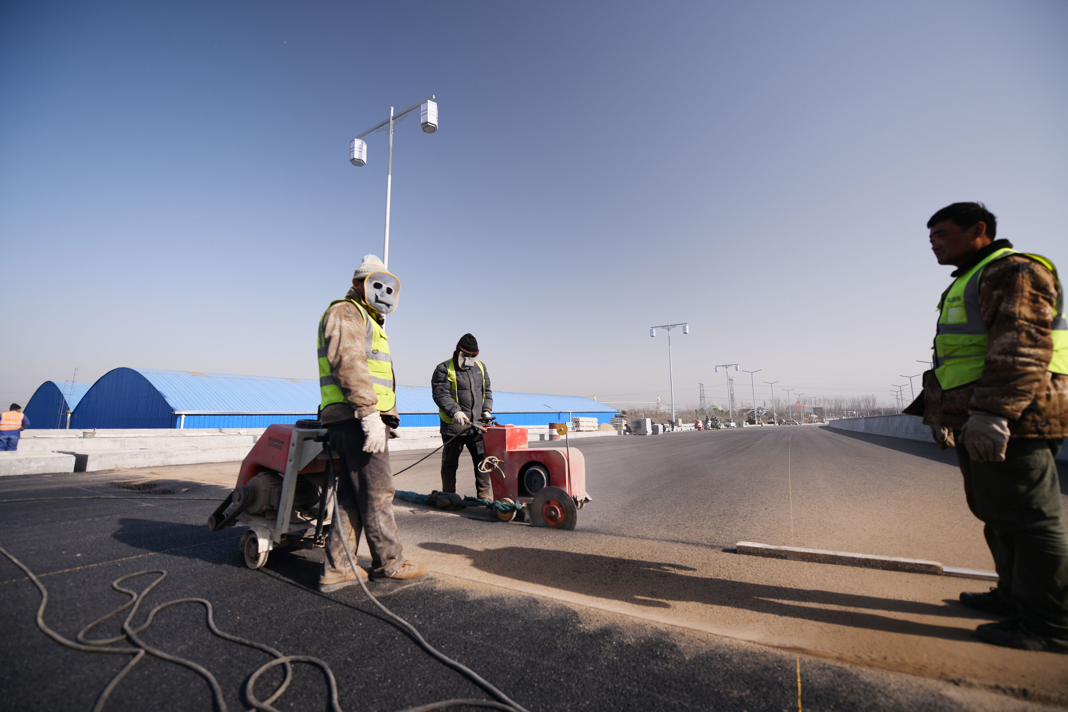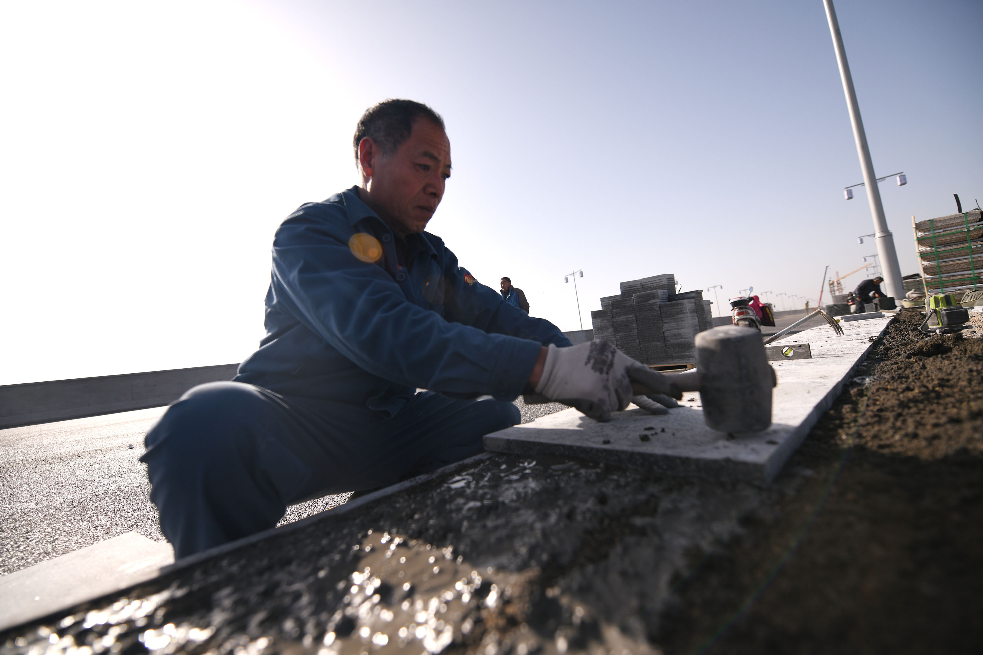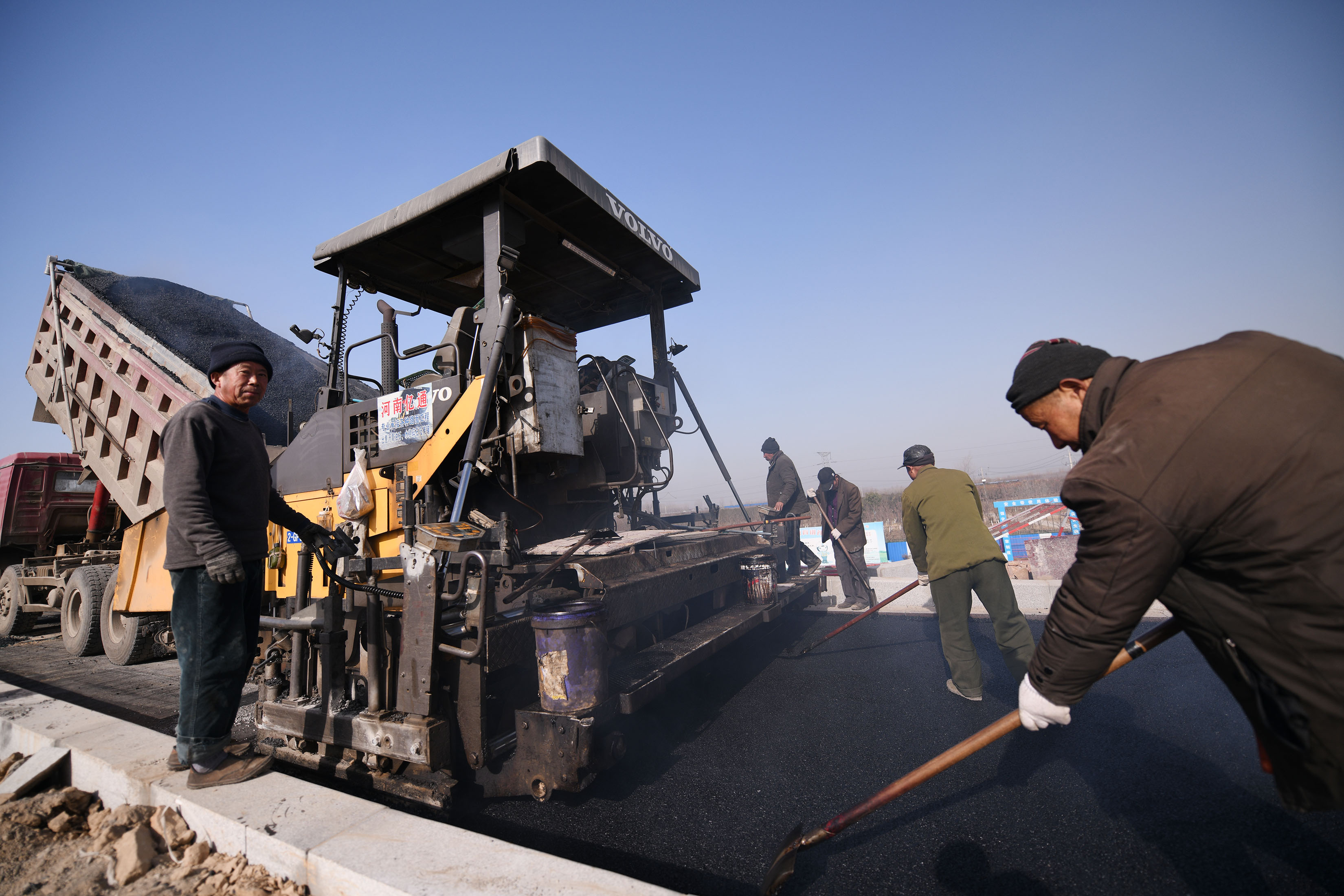 工人們正在進(jìn)行橋縫間對(duì)接路面施工