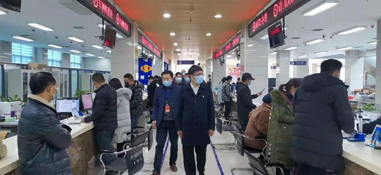 史凱歌、郝寶杰一行對政務(wù)服務(wù)大廳人員信息登記情況、人員管理、“一米線”落實(shí)等相關(guān)工作逐一進(jìn)行檢查,并詳細(xì)了解每日辦件數(shù)量、通風(fēng)消毒等措施落實(shí)到位情況。