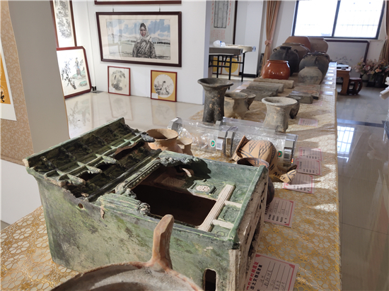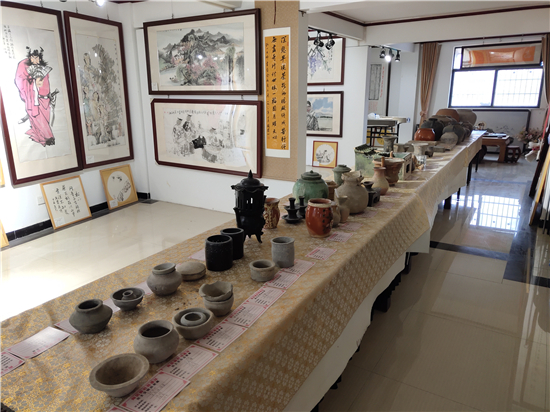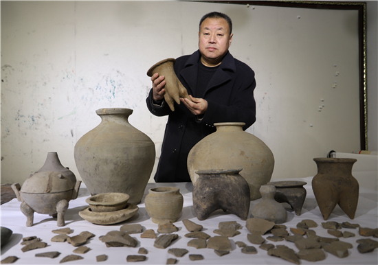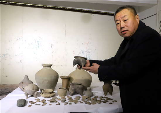 三足燉肉的陶鬲、圓形擦粉的粉盒、前方后圓的灶臺、帶孔過濾的茶罐、廣口大肚的糧罐、象形浮雕的方磚、雙耳大肚的水壺……1月31日,鄲城縣文聯(lián)副主席、收藏家協(xié)會會長閆振宇打開自己的“博物館”,將多年來在鄲城縣丁村鄉(xiāng)陶店村出土并收藏的數(shù)十件陶器向記者展示,以此進(jìn)一步證明陶店遺址是龍山文化新時(shí)期石器遺址,疑為中國灰陶最早生產(chǎn)地,中國陶器之鄉(xiāng)。