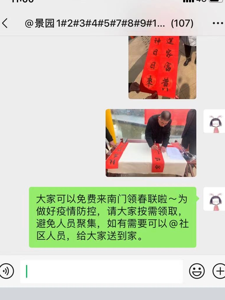2月3日,為做好社區(qū)防疫工作,周口市城鄉(xiāng)一體化示范區(qū)景園社區(qū)一改往年現場寫、集中送的免費送春聯活動形式,把“寫春聯”與“送春聯”分開,通過微信群向社區(qū)居民展示書法愛好者的春聯作品,讓居民在線挑選,按需有序領取,避免人群聚集。同時,針對社區(qū)老年人等行動不便群體,主動送春聯上門,確保送“?!迸c防疫兩不誤。