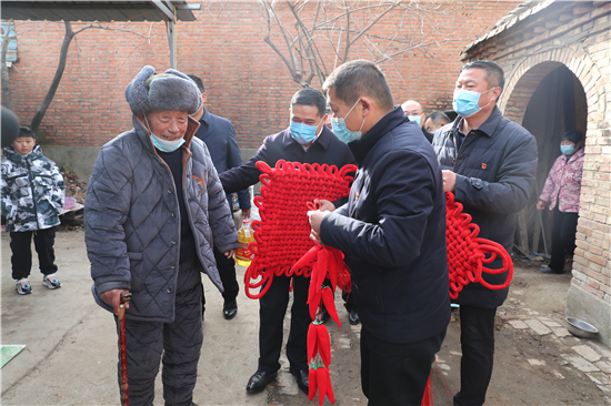 在鄭家集鄉(xiāng)韓樓村,縣農(nóng)商銀行鄭家集支行行長武繼龍帶領(lǐng)員工來到92歲韓老漢的家中,看到韓老漢由于身體原因只能靠拐棍佝僂著背站著,武繼龍緊忙彎腰俯下身說:“大爺,快過年了,我們來看看您,提前給您拜個早年!”“真的是太感謝恁了,這么冷的天,還讓你們來送到家里面。”韓老漢激動地說。