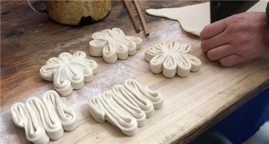 除了平常的白面饅頭,黃師傅還讓妻子現(xiàn)場展示了“棗山”制作,并介紹了棗山的寓意和習俗?!澳憧催@棗山是一層一層的,寓意著步步登高,而且棗山的花形是圓的,代表著團團圓圓。過去出嫁的閨女過年回娘家要帶大饃,娘家要回棗山,現(xiàn)在咱們周口的一些地方還保留著這樣的習俗。”兩位主播體驗了棗山的制作過程,得到黃老板妻子的夸獎:“中!這倆妮兒可巧!”