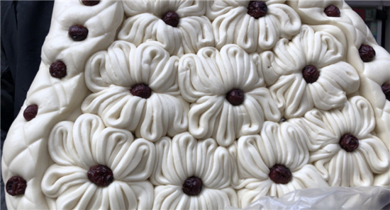 過大年,蒸饅頭。當日9時許,在項城市,兩位主播唱起中國傳統(tǒng)年俗童謠,隨后走進一家饅頭店現(xiàn)場直播年饃制作過程。饅頭店老板姓黃,從事饅頭制作30余年,直播開始即見轟鳴的和面機攪動著巨大的白面團,黃老板介紹說,這次和的面有130余斤,”以前是人工揉面,一個壯勞力一次揉40來斤面就不錯了?,F(xiàn)在機器揉面除了揉的多,而且快,還越揉越白,不像人工揉面越揉越黑。機器揉面越揉越勁道,做出來的饃好吃,我們這兒現(xiàn)在全機械化制作“。