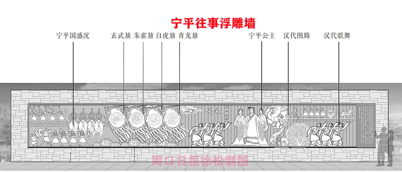 府東路北頭與鄲淮路交叉口占地近30畝的文化廣場(chǎng)是調(diào)水渠“三段銜一園”景觀中核心形象段之一。除了綠樹、百花、清流、步道,以及音樂燈光噴泉、西側(cè)建設(shè)有接近生態(tài)自然的親水觀光平臺(tái)之外,這里的5塊浮雕文化墻值得我們深入了解。這組浮雕墻讓古老與現(xiàn)代在這里交相輝映,昭示著無論社會(huì)和科技如何進(jìn)步,源遠(yuǎn)流長(zhǎng)的傳統(tǒng)文化永遠(yuǎn)是鄲城人的情感歸宿和精神家園。文化廣場(chǎng)的園路、綠地、建筑等都以鄲城歷史文脈為中心,將現(xiàn)代生活元素與歷史文化元素有機(jī)結(jié)合,營(yíng)造了一個(gè)文化與生態(tài)自然融合的新地標(biāo)。