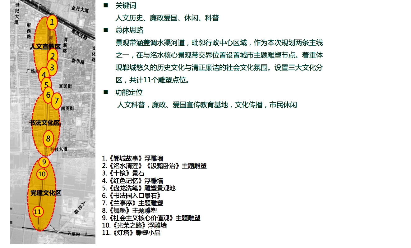 調(diào)水渠景觀在洺河生態(tài)水系“五帶五園一環(huán)多點(diǎn)”景觀中被稱為“人文歷史帶”。全程以“水脈、文脈、人脈”為核心,以“綠色、生態(tài)、休閑、文化”為理念,建設(shè)了“三段銜一園”的景觀結(jié)構(gòu),有鄲淮路至廣場(chǎng)南路的景觀核心形象段、廣場(chǎng)南路以南至科技大道的書法體驗(yàn)段、科技大道以南至五里河的教育文化段和位于交通路與英博路之間的書法生態(tài)休閑園。全段景觀以人文歷史為主題,分別設(shè)置了文化廣場(chǎng)、汲黯廣場(chǎng)、廉政廣場(chǎng)、書林步道、墨香廣場(chǎng)、歷史長(zhǎng)廊、書法公園等19處景觀節(jié)點(diǎn)。
