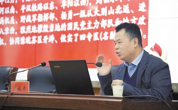 2月26日下午,商水縣舉行學(xué)黨史國(guó)史紅色教育大講堂活動(dòng)。商水籍北大學(xué)子劉水龍結(jié)合史料,精彩講述賀龍北伐在商水播下革命火種、彭雪楓經(jīng)周口東進(jìn)豫皖蘇燃起商水革命烈火、豫皖蘇軍區(qū)解放周口商水浴火重生,以及火熱革命中涌現(xiàn)出來的商水英烈艾力、趙海靜,支前模范徐乃貞等人的英勇事跡。這些生動(dòng)鮮活的歷史人物故事,再現(xiàn)了英雄兒女在商水大地上勇于革命、不怕犧牲的紅色革命歷史。劉水龍用豐富的史實(shí)、鮮明的觀點(diǎn)、精辟的講述,贏得臺(tái)下聽眾陣陣掌聲。記者 付永奇 攝