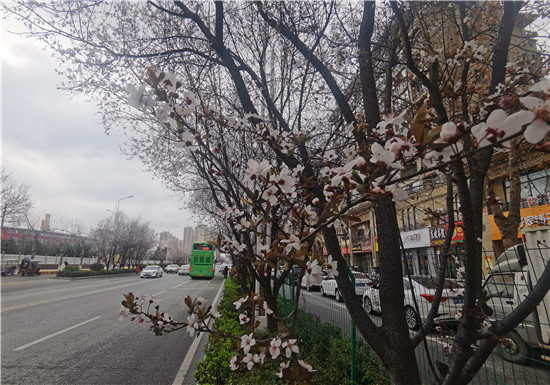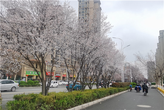 3月1日,慶豐街道兩邊的紫葉李花開(kāi)似雪,紫葉李貫穿整個(gè)慶豐街,形成了一道靚麗的風(fēng)景。盛開(kāi)的紫葉李花瓣兒呈白色或粉色,微風(fēng)拂過(guò),花瓣兒飄散在空中,為過(guò)往的車輛下起了晴天里的花瓣雨。