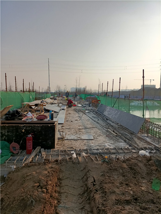 工人們?cè)谕輿_溝一處新建的景觀橋上施工