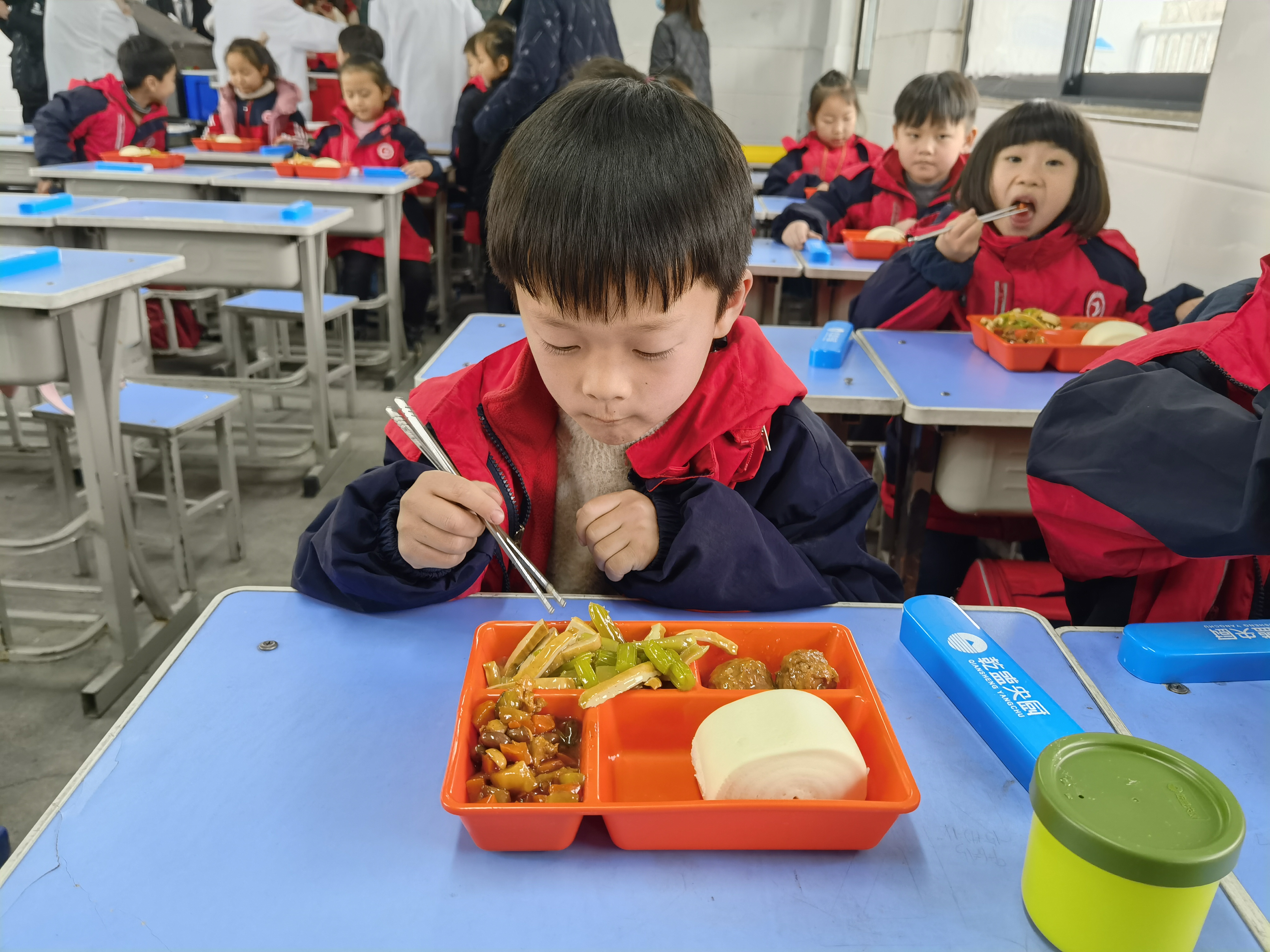 七一路二小校長邵在斌說:“中午配餐和延時服務是市委、市政府實實在在的惠民工程。為了做好這項工作,我們前期去鄭州參觀學習,回來按照文件精神去做。中午配餐解決很多問題,一是家長接學生難,輔導作業(yè)難的問題,我們中午配有語文老師,晚上配有數學老師給學生輔導作業(yè)。二是延緩了學校周邊交通壓力。三是能保證學生休息時間,為了配合延時服務,我們的上課時間從8點調整到8點30分,但開門時間還是7點20分,方便上班早的家長送學生。本次送餐1200多份,每班用餐時兩名教師在崗,吃完飯后留一名老師輔導學生。今天我們全員監(jiān)督配餐,領導全部在崗,校長分包樓,中層領導分包層,責任到人,保證每個孩子用餐安全,讓每位家長都安心。”③7