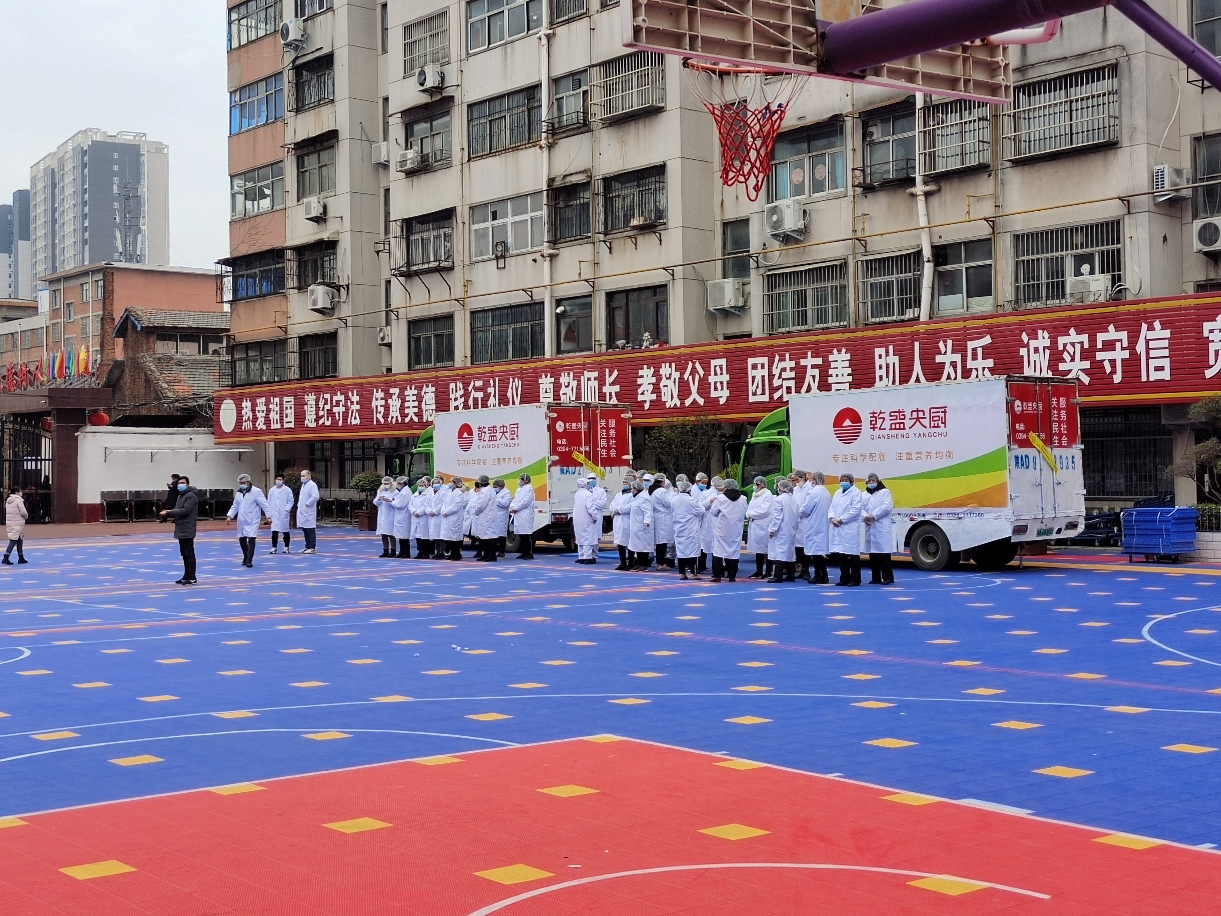 11時許,13000余份熱騰騰的飯菜即將送到周口市中心城區(qū)中小學生手中,直播團隊對七一路二小的配送情況進行現場直播。兩輛運餐大卡車,20余名工作人員整裝待發(fā),乾盛央廚鄭州總公司的營銷部負責人現場指揮調度七一路二小的發(fā)餐工作。揭掉卡車上的封條,留樣,測溫,裝車,按班分送,分發(fā)不銹鋼餐具,“哇!獅子頭?。 痹诤⒆觽兊捏@呼聲中,兩葷一素,一份米一份湯,熱氣騰騰地盛到孩子手中的餐具中?!昂⒆觽兂圆怀缘娘栄??”面對各直播平臺上網友的提問,乾盛央廚鄭州總公司營銷部負責人回答:“我們提前有準備,飯、菜我們都免費加,保證孩子們都吃飽,請家長朋友們放心?!?/p>